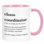 - PRINTED ON BOTH SIDES: "Chaos Coordinator someone who solves problem" is printed on both side of the mug. The wall of this chaos coordinator coffee mug is white outside and pink inside. The combination of color and the layout of printing are concordant and aesthetically pleasing.
