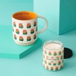 - White ceramic mug features tiny dumpster fire designs and a funny message inside the rim, orange interior, oversized handle and recessed bottom designed for stacking. Inside mug: "Everything’s fine."